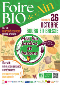 La 15ème édition de la Foire Bio de l’Ain se déroulera le dimanche 26 octobre sous le marche couvert de Bourg-en-Bresse, de 9h à 17h.